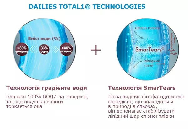 Перші і єдині в світі контактні лінзи з водоградієнтного матеріалу: більше 80% вологи на поверхні і пропуск кисню 156 Dk/t.